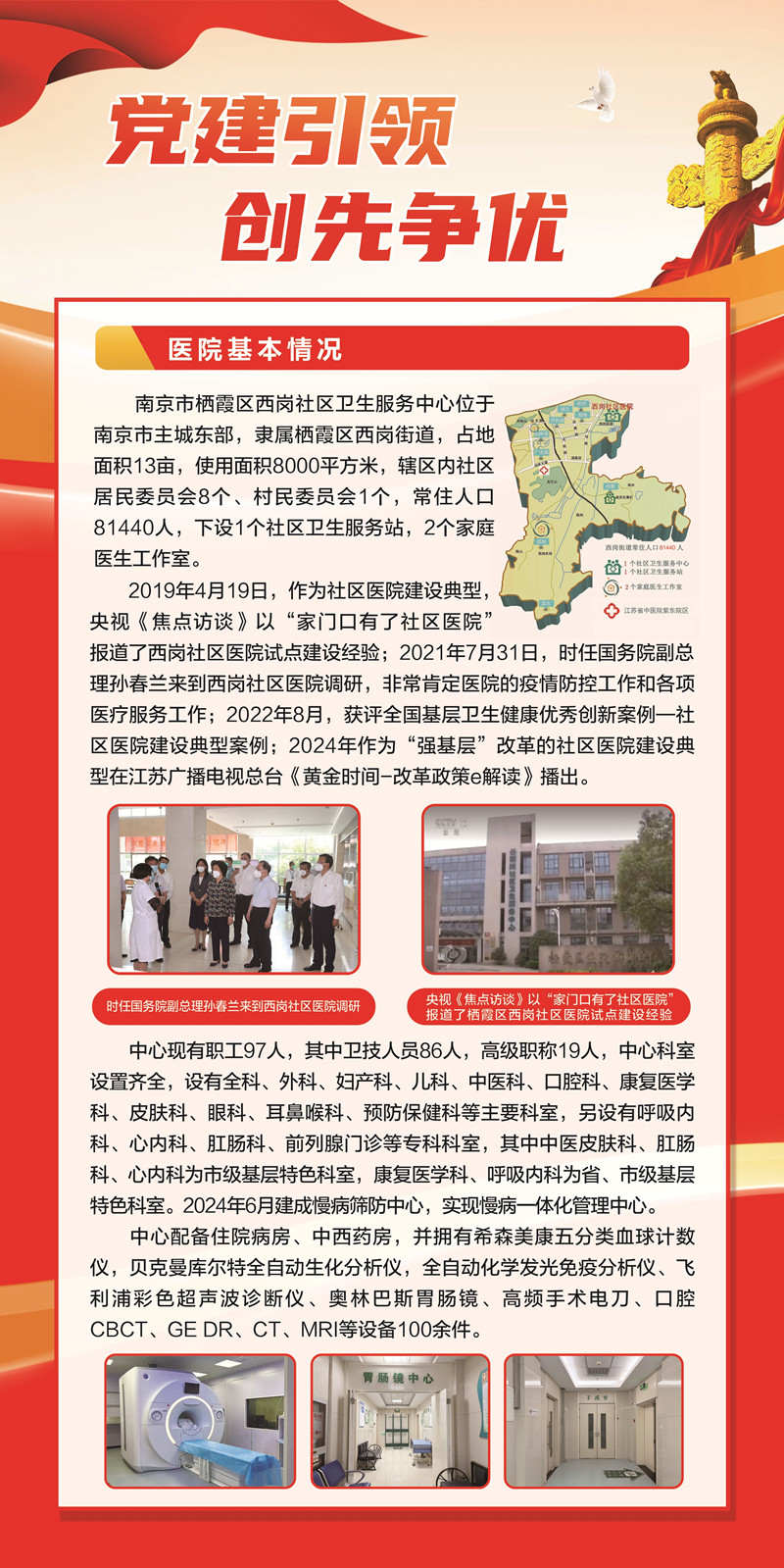 西岗社区卫生服务中心位于南京市栖霞区西岗街道尤山路18号,建筑面积6300平方米,开设病床40张。2013被评为省级示范社区卫生服务中心;2017年被评为全国优质服务示范社区卫生服务中心;2018年为“江苏省家庭医生签约服务创新单位”;2018年获评“江苏省社区医院”;2019-2020连续两年达到“国家优质服务基层行”推荐标准。