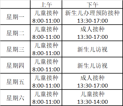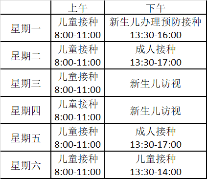 1. 预防接种证及儿童保健手册请家长妥善保管,入托人园必备。 2. 预防接完成后请留观室留观30分钟后,在留观机上刷条码后离开。以免影响下次疫苗接种。 3. 如您的孩子有热、腹泻等症状至少治愈两周后至门诊接种,特殊情况至门诊咨询。口服疫苗前后半小时不要吃奶或热的食物。 4. 如更换手机号码,请及时与我们联系修改。迁出省外的儿童,请及时办理迁出手续,以免贻误你在外地的疫苗接种。 5. 免疫规划疫苗免费接种至6周岁,非免疫规划疫苗自愿自费接种。 6. 到目前为止,任何疫苗的保护效果都不能达到100%。少数人接种后未产生保护力,或者仍然发病,与疫苗本身特性和受种者个人体质有关。 7. 在每次疫苗接种后注意看护和观察,如发现婴幼儿有任何不适的临床症状和体征,应第一时间到医院就诊并向接种单位报告。 8. 预防接种时间: